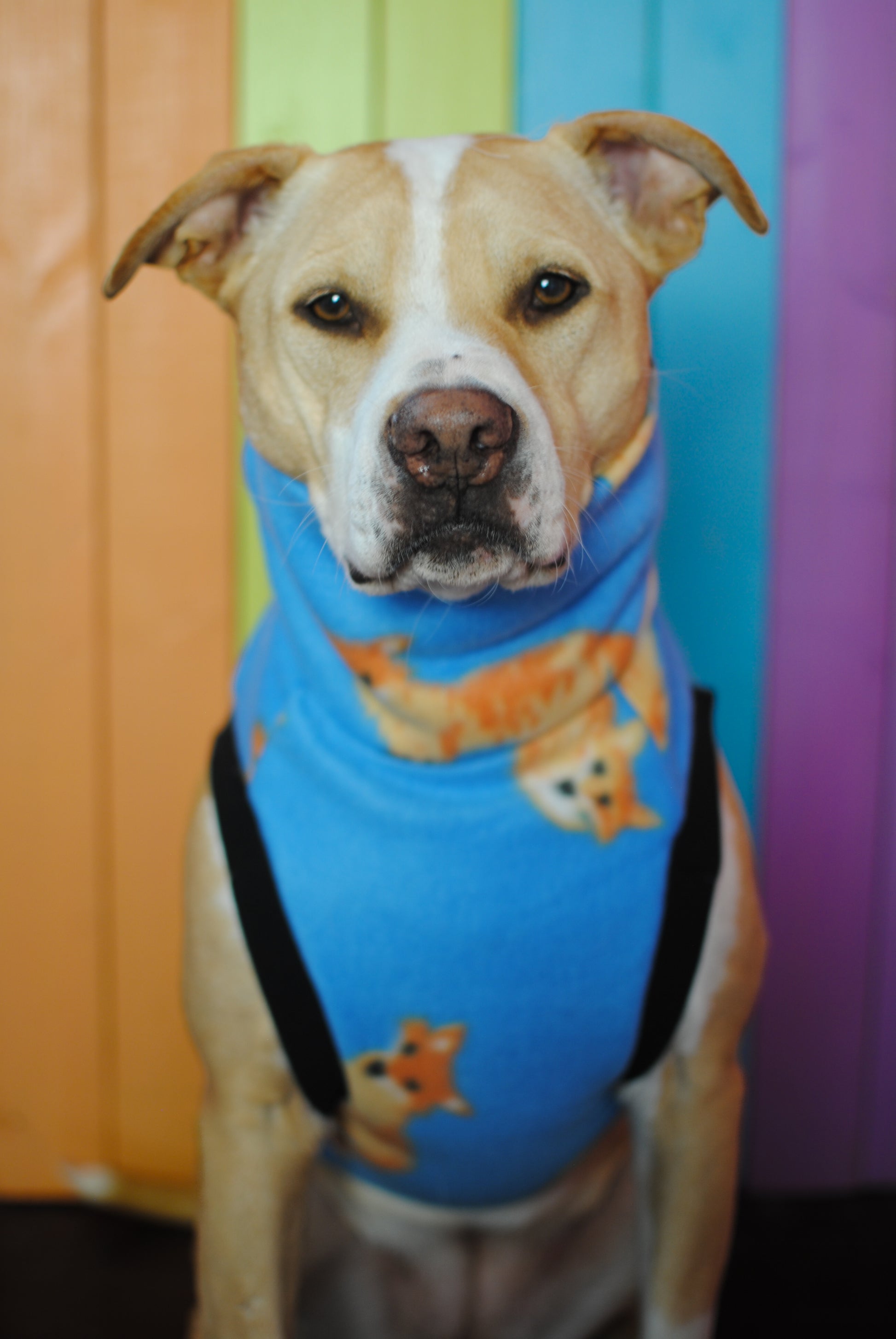 Each dog sweatshirt is made by hand by me! Each one of made from super soft fleece and stretchy cotton to secure all legs in place. Each sweatshirt is machine washable for when your pup gets a little messy! Each sweatshirt is also modeled by one of my amazing dogs to give you a good estimate on size. In this photo is Dolly Parton! She is a Staffordshire terrier mix who weighs 54 pounds!