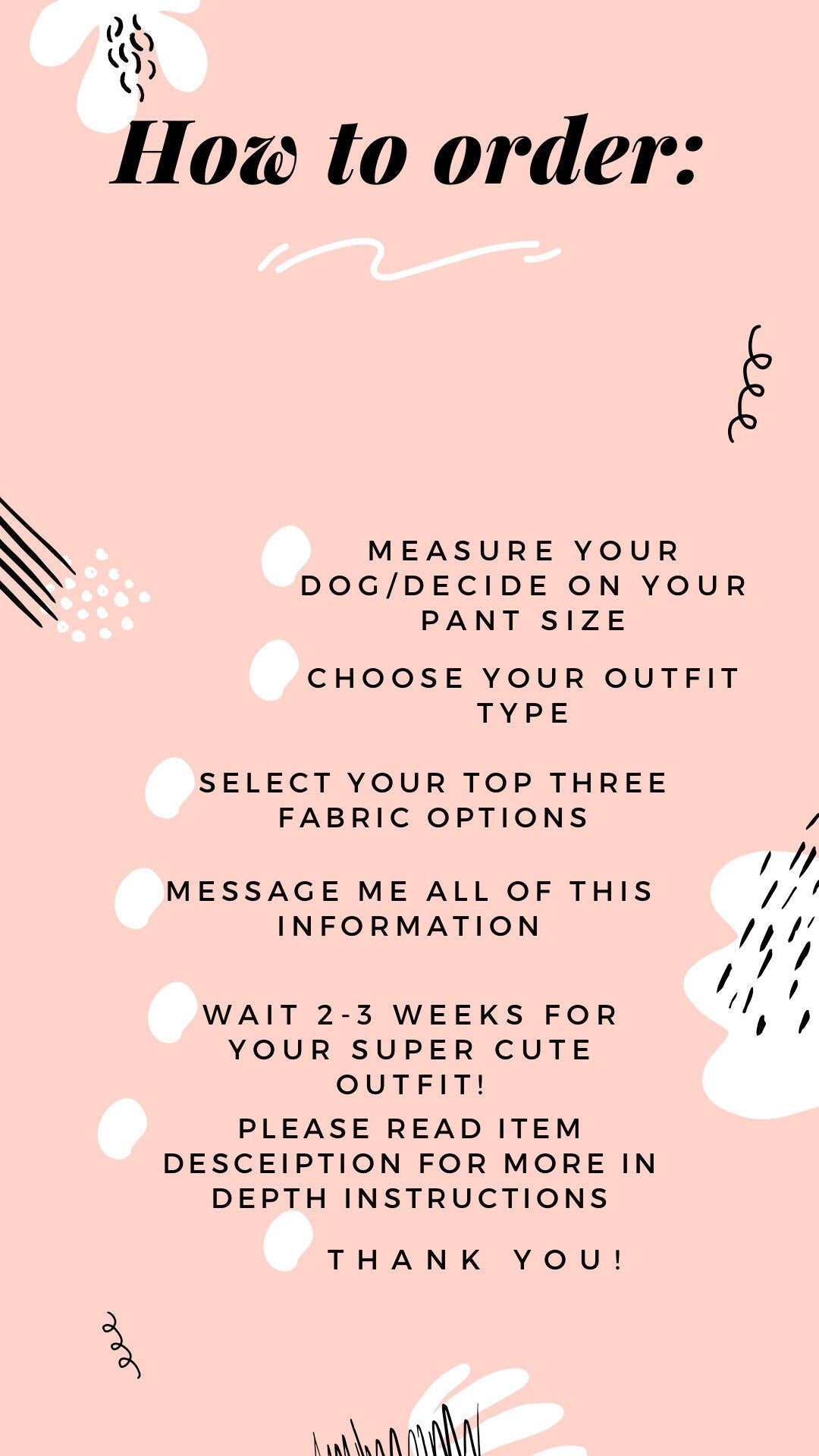 Please make sure you have read all shop policies before placing your order. You must email us your dogs measurements and any other personalizations needed for your order within one week of purchase or your order will be cancelled. You can contact us on any of our social media or our email pawsandwhiskersfarm@gmail.com