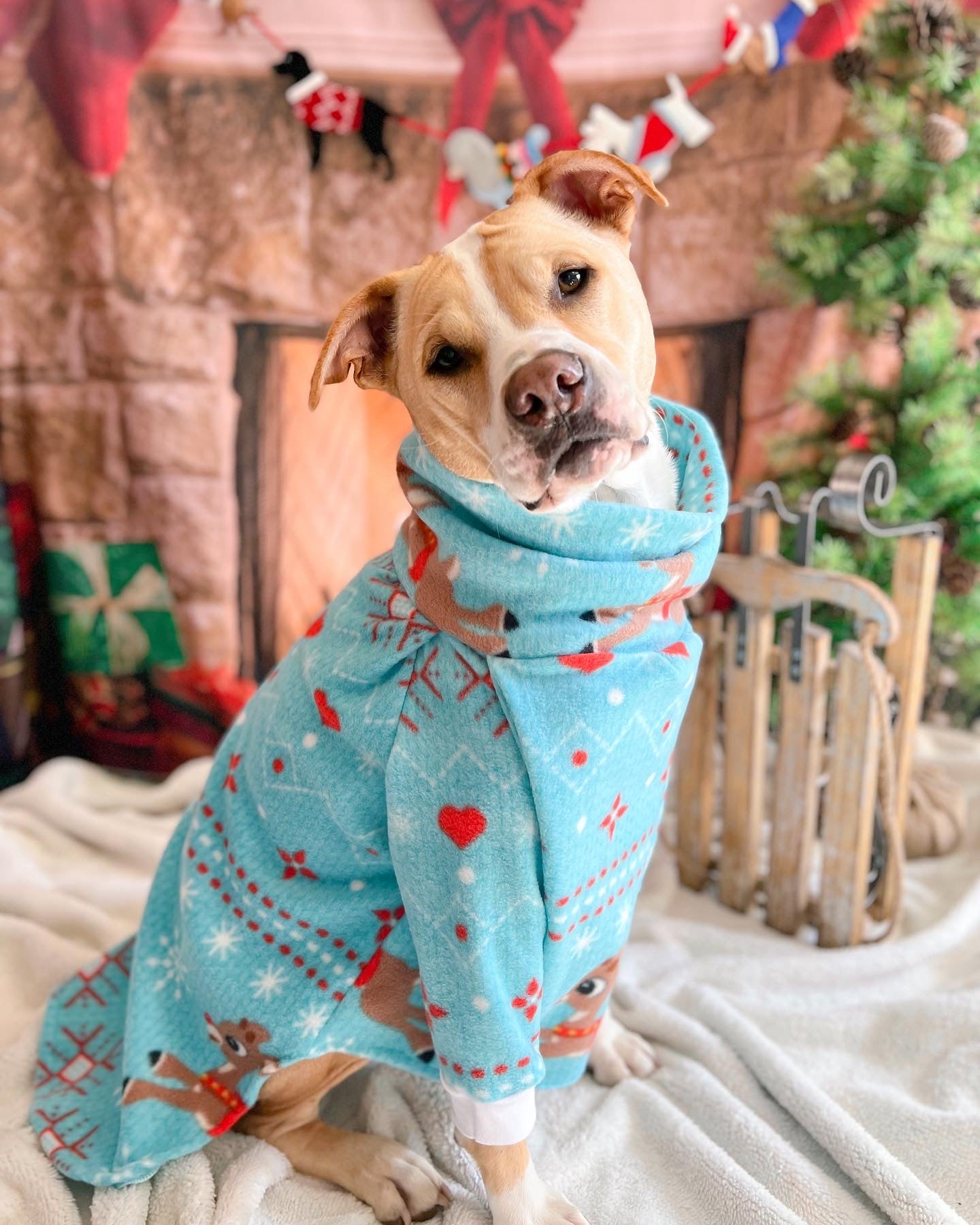 Each dog sweatshirt is made by hand by me! Each one of made from super soft fleece and stretchy cotton to secure all legs in place. Each sweatshirt is machine washable for when your pup gets a little messy! Each sweatshirt is also modeled by one of my amazing dogs to give you a good estimate on size. In this photo is Dolly Parton! She is a Staffordshire terrier mix who weighs 54 pounds!